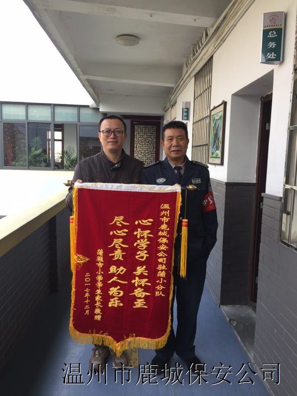 前不久,温州市鹿城区蒲鞋市小学一(5)班戴左呈小同学家长来学校将一面锦旗递到了驻校保安员叶昌华的手中。到底怎么回事呢?原来今年10月的一天课间休息时间,戴同学急速奔跑玩耍时与另一同学猛烈相撞,造成内出血,情况紧急!叶昌华与同事闻讯急忙赶到现场背起戴同学就直奔医院。由于抢救及时,才化险为夷。